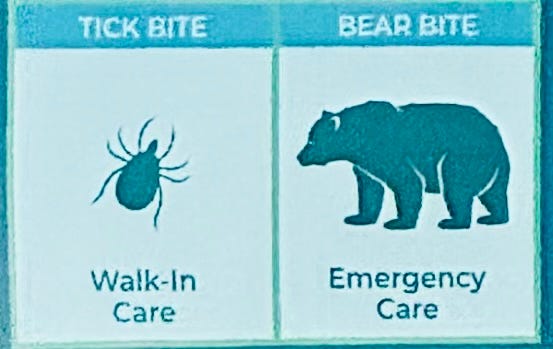 Intuitively, I think we know that there are different areas of the hospital but as part of this guide I want to explain a few. We are likely familiar with clinics (family practice, pediatrics, OB, etc.). These are where our primary care doctors are. Then there are specialists (heart, cancer, urology, etc.). There is the walk-in which is designed for non-life-threatening illness or injury (like a tick bite). Then there is the emergency department which is for bigger injuries (like a bear bite).